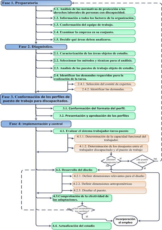 De las metodologías estudiadas, las que abordan la evaluación de los puestos y sus adaptaciones de manera más rigurosa son las propuestas por Herranz (2009) [16], pero todas ellas carecen de las herramientas para la identificación y evaluación de puestos de trabajo, que permita a los lectores una aclaración del cómo identificar las demandas de los mismos, a las cuales deben realizarse los rediseños arquitectónicos según las capacidades de las personas con diversidad funcional, pues en ellas solo aclaran como rediseñar y adaptar estos puestos desde el punto de vista ergonómico. Atendiendo a esta deficiencia, se elabora un procedimiento que integre las herramientas de análisis de puestos de trabajo, que permitan el ajuste de los mismos a personas con diversidad funcional.