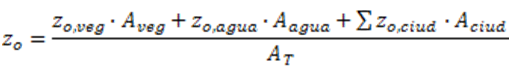 Donde corresponde al valor de longitud de rugosidad obtenido por el método morfométrico NDVI para las zonas rurales, área de vegetación de la zona circundante a las estaciones, y longitud de rugosidad para la clase de ciudad y agua respectivamente, obtenidas por el método de las clasificaciones, y áreas que ocupan las clases de ciudad y agua respectivamente, área total.