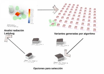 Los problemas multi-objetivo, tienen objetivos parciales que están en conflicto entre sí[6], cuando uno se mejora el otro empeora siendo difícil buscar armonía en su relación. El ejemplo a continuación (Figura. 5) es una cubierta con las reglas de posición del caballete, rotación con respecto al norte y dimensiones según parámetros modificables los cuales reciben el nombre de genes, a través del algoritmo genético es posible buscar cual es la variante más adecuada modificando este genoma de modo que se obtenga mayor radiación para el posicionamiento de paneles solares. Se utilizó Galápagos Evolutionary Solver, elaborado por David Rutten y Ladybug para los análisis de radiación sobre la volumetría generada en Rhino3D y GH.