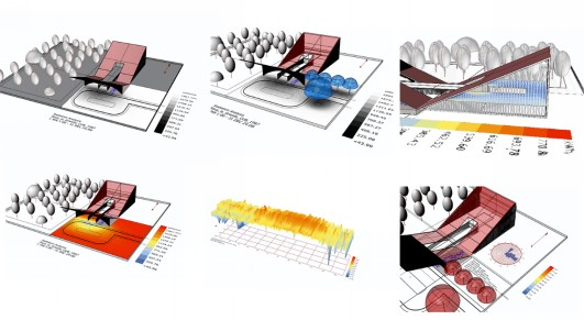 En este ejemplo se muestra lo referente a la simulación ambiental [7] que puede realizarse a una obra o contexto, para evaluar las condicionantes y criterios, además de simular los comportamientos de elementos en función del confort ambiental. Lo relevante de esto no es solo el análisis sino la posibilidad de experimentar las soluciones que pueden funcionar en esas condiciones, permitiendo la reducción de errores.