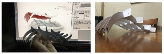 Se utilizó una superficie guía para la distribución de los elementos tanto en longitud como su latitud (UV), los cuales se dispusieron orientados en el plano xy para su posterior impresión y ensamblaje. Este proceso es utilizado en la creación rápida de prototipos como el ejemplo mostrado, se pueden mostrar diversas técnicas de fabricación, tanto aditivas (impresora 3d), como técnicas sustractivas (corte por láser y fresado).