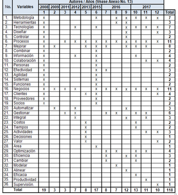 El grupo 1, compuesto por dos definiciones, es representativo al utilizar veinte variables, coinciden en diecisiete de ellas; el grupo 2, formado por siete definiciones y veintiuna variables, existe mayor consenso en negocios, procesos, gestionar y mejorar, además de metodología, tecnologías, automatizar y eficiencia; y el grupo 3, integrado por tres definiciones, representado por dieciocho variables, existe mayor consenso en procesos y actividades, además de metodología, tecnologías, mejorar, colaboración, negocios, clientes y valor.