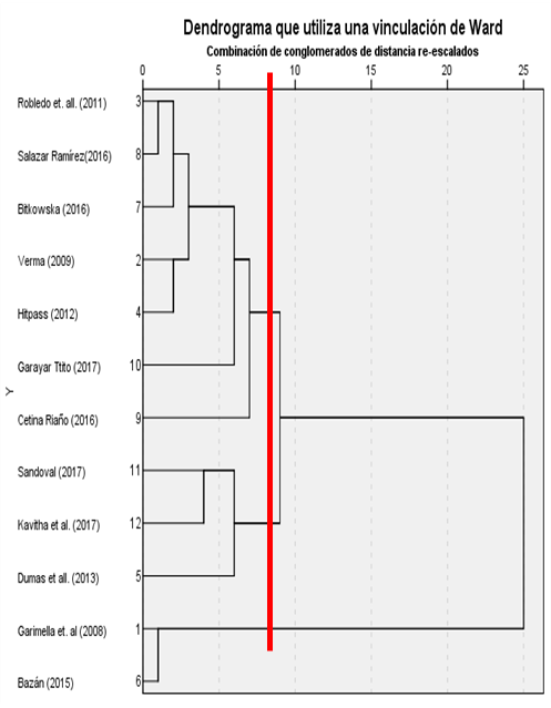 Se procesa la información resultante de la matriz binaria que considera la existencia o no de las variables de los conceptos estudiados en el software del paquete estadístico IBM SPSS. Se realiza un análisis de conglomerados jerárquico, donde se aplica el método de Ward y se utiliza la medida de Intervalo de Distancia Euclídea al Cuadrado, de acuerdo a las características de la escala utilizada, para evaluar las variables identificadas.