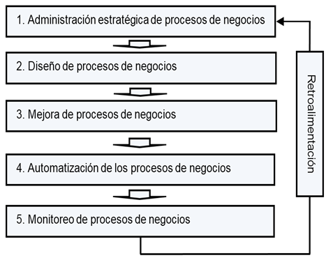 9. Conjunto de metodologías, técnicas y herramientas que ayudan a diseñar, controlar, automatizar, integrar y mejorar los procesos de una empresa, alinea los procesos y recursos a la estrategia y objetivos del negocio con el fin de mejorar la eficiencia y asegurar el cumplimiento de los mismos, Cetina Riaño [31].