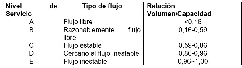 A partir de la construcción de la gráfica de tasa de flujo vs velocidad media espacial y utilizando la relación volumen/capacidad se puede determinar el tipo de flujo al que opera la vía analizada y por consiguiente se puede establecer el nivel de servicio. [12] plantean una relación volumen/capacidad para cada tipo de flujo, la cual se muestra en la tabla 4. En la presente investigación se recomienda utilizar la relación volumen/capacidad propuesta en la tabla 4 para determinar el tipo de flujo al cual opera la carretera analizada.