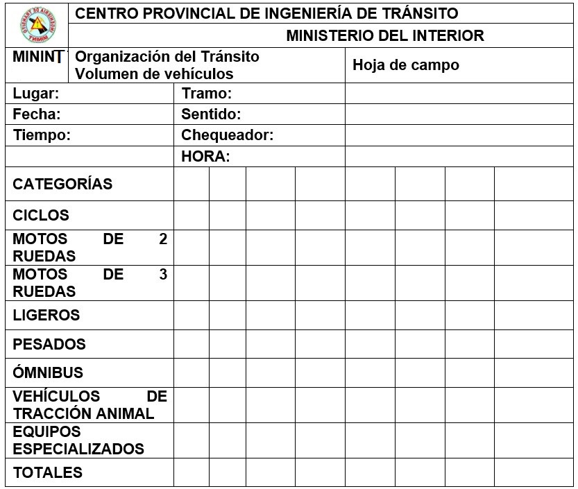 A partir de todo lo expuesto en relación a los métodos para estudios de volúmenes de tránsito se decide que para Cuba el aforo vehicular más conveniente a realizar es de forma manual con apoyo de la cámara de video en los tramos de la carretera seleccionada para el estudio y se emplea el modelo utilizado por el Centro Provincial de Ingeniería de Tránsito, como se muestra en la tabla 1.