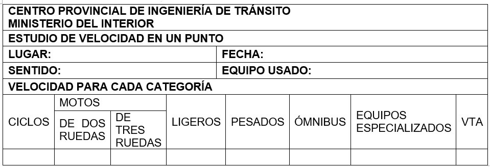 Según el Manual de Trabajo de Ingeniería de Tránsito del año 2007, los estudios de velocidad se realizan mediante dos medios: la pistola radar y el enoscopio o manual en caso de no disponer del equipo. Antes de comenzar cualquiera de los métodos, es imprescindible llenar en el modelo los siguientes datos:
