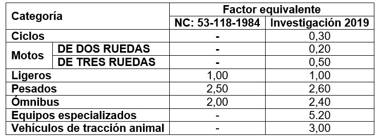 Debido que por las carreteras de Cuba el tráfico que circula es de naturaleza heterogénea los factores de equivalencia vehicular empleados son los que recomienda la NC: 53-118-1984 (Métodos de cálculo de las capacidades, volúmenes y niveles de servicio en Cuba). Esta norma está basada en el Manual de Capacidad de Carreteras del año 1965, el cual tiene en cuenta las condiciones de tránsito de los Estados Unidos. Además, es importante agregar que dicha norma posee más de treinta años de conformada y solo considera los coeficientes de equivalencia vehicular para autos, ómnibus y camiones; lo que no coincide con la variedad de vehículos que circulan hoy en día por las carreteras de Cuba [10].