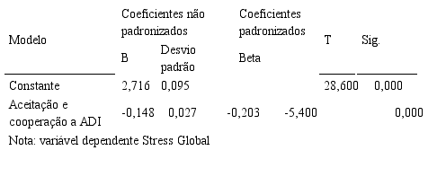 O coeficiente de determinação (R2) representa a medida da proporção da variância da variável estresse global em torno da média, que é explicada pela variável aceitação e cooperação a ADI. Com isso, o resultado do coeficiente de determinação sugere que 4,10% da variação no estresse global é explicada pela percepção da mudança (R2 = 0,041). Esse valor pode ser considerado satisfatório, uma vez que somente uma variável independente foi proposta no modelo. Os fatores que levam o indivíduo a apresentar altos níveis de estresse são vários, ou seja, o estresse é um fenômeno complexo e explicar aproximadamente 4% da sua variação somente a partir da perspectiva da resistência à mudança organizacional é relevante.
