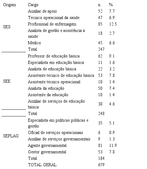 A distribuição da amostra, considerando seu local de trabalho, pode ser considerada equitativa entre a Secretaria de Estado da Educação (SEE), 38,6%; Secretaria de Estado do Planejamento (SEPLAG), 29,7%; e Secretaria de Estado da Saúde (SES), 31,7%.