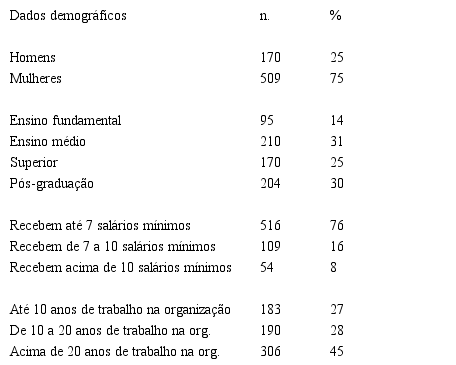 Os dados demográficos dos respondentes podem ser visualizados na Tabela 2. Em geral, 75% da amostra é composta por mulheres, 55% possuem o nível de escolaridade alto (superior e, ou, pós-graduação) e 76% recebem até sete salários mínimos. Quanto ao tempo de trabalho na instituição, 45% dos participantes responderam que trabalham há mais de 20 anos na mesma organização. Esse número reforça uma característica do setor público decorrente da estabilidade do emprego.