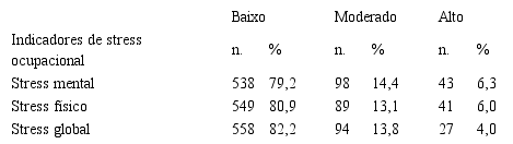 Para analisar o estresse no trabalho dos servidores, primeiramente, calculou-se um indicador ancorado nas médias das respostas para as duas variáveis analisadas (estresse físico e mental). Com isso, denominou-se estresse global o resultado da média das respostas relativas ao desgaste mental e ao desgaste físico. De acordo com estudos anteriores, para facilitar a interpretação, foram definidos três níveis de intensidade de estresse: baixo (médias entre 1,00 e 2,99), moderado (médias entre 3,00 e 3,99) e alto (médias entre 4,00 e 6,00). A Tabela 3 mostra os resultados dos níveis de estresse dos servidores.
