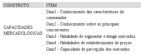 Para a identificação das variáveis que apoiarão a mensuração do construto Capacidades Mercadológicas, foi considerado o estudo de DeSarbo et al. (2005). As razões da escolha dessa escala fundamentam-se em dois pontos: ela apresenta uma escala consistente em outras pesquisas, sendo ainda de fácil autoaplicação; e possui valor no diagnóstico para os estrategistas organizacionais, sendo validada em outras pesquisas e, inclusive, no contexto da hotelaria no Brasil (SONG; NASON; BENEDETTO, 2008, CARVALHO, 2011). No Quadro 1, são apresentados o construto capacidades mercadológicas e os itens que o compõem.