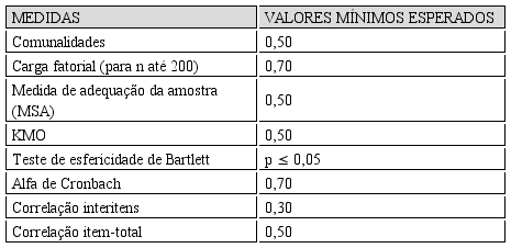 A seguir, no Quadro 3, são apresentados os valores mínimos esperados para as medidas de comunalidades, carga fatorial, medida de adequação da amostra (MAS), KMO, Teste de esfericidade de Bartlett, Alfa de Cronbach, Correlação interitens e Correlação item-total.