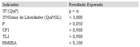 Os índices de ajuste que foram utilizados são: valores do qui-quadrado, qui-quadrado dividido pelos graus de liberdade, CFI, NFI e TLI. Como parâmetros aceitáveis, temos a significância qui-quadrado dividida pelos graus de liberdade maior do que a significância do teste (p > α) e o valor da relação menor ou igual a três, CFI, NFI e TLI maior ou igual a 0,90 (HAIR et al., 2005).