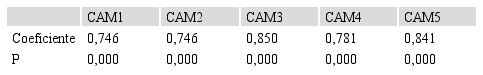 Pelos resultados apresentados para a medida de adequação da amostra (MSA) do construto, os dados apresentam-se como acima do mediano, pois, para Hair et al. (2005), a interpretação de 0,80 ou acima é considerada admirável. Portanto as variáveis, Cam1, Cam2, Cam3, Cam4, e Cam5, foram todas aprovadas.