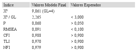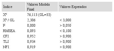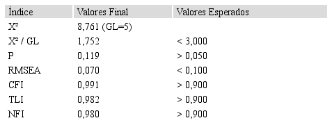 Após a análise, verificou-se que os resultados para os índices de ajuste para medidas absolutas (valores do qui-quadrado, qui-quadrado dividido pelos graus de liberdade e a raiz do erro quadrático médio de aproximação - RMSEA) e os índices de ajuste de medidas incrementais absolutas (CFI, NFI e TLI) estão bem ajustados e seus valores esperados foram maiores que os valores mínimos esperados.