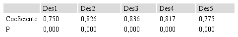 O indicador Des1, com o valor igual a 0,750, é o indicador com o menor valor encontrado. Com esses resultados, todos os indicadores foram mantidos, uma vez que são superiores ao mínimo aceitável. Os indicadores Des1, Des2, Des3, Des4 e Des5 foram aprovados pelo teste de significância, por estarem respeitando o valor limítrofe.