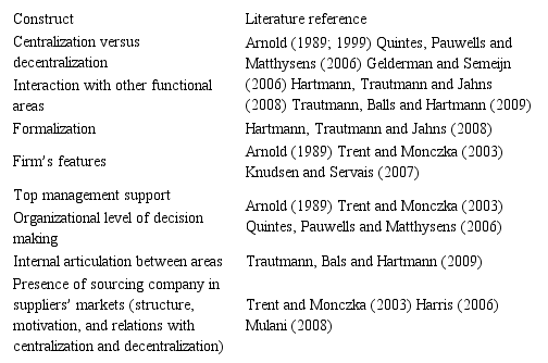 The structuring of a company’s resources, process and supplier management are some of the aspects that must be included in the GS management process. We considered organizational structure as the determination of the roles, power, responsibilities, control, coordination and information flows between the different levels of management in order to bring together functions, people and other resources to achieve the companies’ objectives. The decisions related to configuration and coordination are key dimensions of an internationalization strategy (PORTER, 1986). A third element was included in this concept to investigate organizational structure: information. This element was add because it allows us to understand how a process flows through the organizational structure. Based on the literature review of GS, it was identified a set of constructs that were already used to investigate companies’ organizational structure related to GS. We used these constructs as a way to guide our research. Figure 1 presents these constructs and their literature reference.