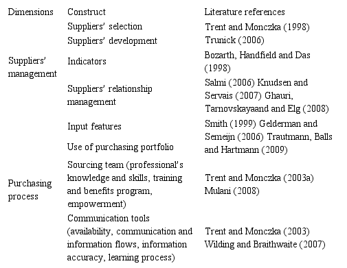 The process of GS is considered as the process of the purchasing area to promote the entrance of inputs in the materials sourcing flow, and it must be considered that this area is not responsible just for the supply of materials, as services are also related. The investigation of a sourcing process involves the study of (1) the selection and development suppliers and (2) the analysis of the participation of the purchase areas in the supply materials flow (LIMA, 2004). We divided this process in two dimensions: the suppliers’ management aspects and the purchasing process. Based on the literature review of GS, it was identified a set of constructs that were already used to investigate companies’ process of GS. We used these constructs as a way to guide our research. Figure 2 summarize these findings.