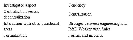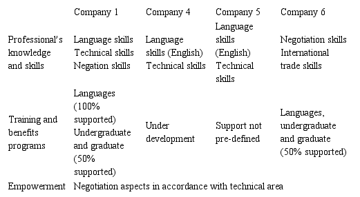 The fourth investigated aspect is the internal articulation between areas. The four companies identified the necessity for the establishment of a closer relationship between the areas of sourcing, engineering, R&D and sales. This internal articulation was perceived to be less strong at Company B; this could be related to company size, as Company B is the biggest company in the sample.