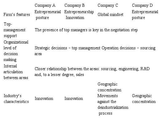 Company D highlights the importance of alignment between the top management and the engineering areas to identify the supply opportunities abroad. The findings presented above are also related to the third aspect investigated, the organizational level of decision-making. Decisions related to the establishment of a relationship with a supplier are performed by the top management, while operational decisions are made by the sourcing areas in the four investigated companies.