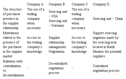 The companies without sourcing units abroad look for other ways to establish a presence in the supplier market. Company A and Company C report the use of a trading company to support its activities, especially when working with new markets. They use the knowledge of the trading company regarding the suppliers located in the specific countries or specific products. Figure 5 summarizes these findings.