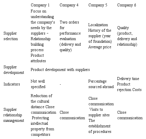The close communication desired by the companies represents a way to manage suppliers. The relationship aspect was also identified as very important to the companies, even though they face difficulties as a consequence of the cultural distance between them and their suppliers.