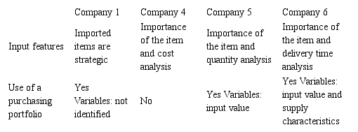 The analysis of the purchasing process is related to the investigation of the input features and how they are considered in this process. There is a consensus that the items ordered from abroad must be considered strategic by the companies because of the risks and complexity associated with this process. As a result, Company 4 identified a disconnection between supply and R&D: “(R&D) is worried with the item, independent of its country of origin”. To understand how the companies classified their inputs as strategic, the use of a purchase portfolio was investigated. Company 1 developed its own portfolio. Company 5 and Company 6 also use a portfolio. Company 4 does not have a purchase portfolio. The findings are summarize in Figure 7.