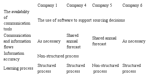 The communication and information flows with the suppliers were also investigated. Companies 4 and 5 argue that they keep an open line of communication and information flow based on annual forecasts. With respect to information accuracy, all companies presented arguments related to its importance, but they did not present a formal process related to verifying its accuracy.