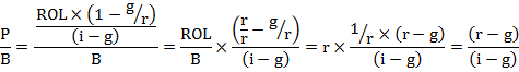 Observa-se, pela Equação 2, que os fatores determinantes do P/B são: retorno, custo de capital e crescimento. Para os casos particulares de: (i) crescimento igual a zero, o P/B é igual a r/i e (ii) retorno igual ao custo de capital, o P/B é igual a 1. Nesse segundo caso particular, nota-se que, quando a empresa não agrega valor (retorno igual ao custo de capital), ela vale o próprio capital investido (P = B).