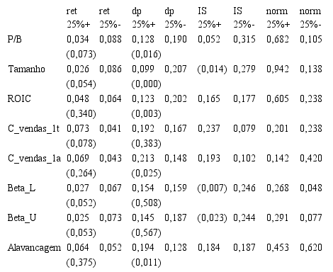 Em seguida, comparou-se o retorno e desvio padrão, pelos 40 trimestres, das carteiras com maior P/B (25%+) e da carteira de menor P/B (25%-) (idem para as demais variáveis). Também calculou-se o Índice de Sharpe (SHARPE, 1966) para cada estratégia (considerou-se como taxa livre de risco o retorno da Selic que foi, em média, no período de análise, 2,79% a.t.). A Tabela 4 apresenta o resumo dos resultados de cada estratégia de investimento.