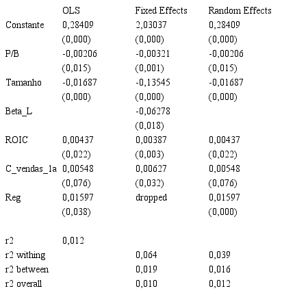 Por fim, mas sem ser um dos objetivos explícitos do trabalho, testou-se a significância do P/B no retorno das ações das empresas da amostra pelo período de análise, identificando uma relação negativa estatisticamente significante.