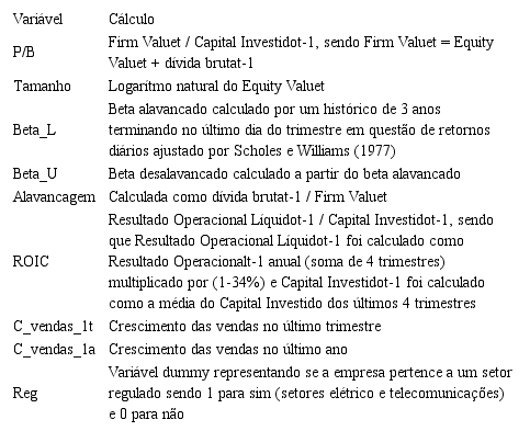 Foram utilizadas as variáveis: price to book do ativo (P/B), tamanho (Tamanho), beta alavancado (Beta_L), beta desalavancado (Beta_U), endividamento (Alavancagem), retorno sobre capital investido (ROIC), crescimento das vendas no último trimestre (C_vendas_1t), crescimento das vendas no último ano (C_vendas_1a) e uma variável dummy, representando se a empresa pertence a um setor regulado (Reg). A Tabela 1 detalha como cada variável foi calculada.