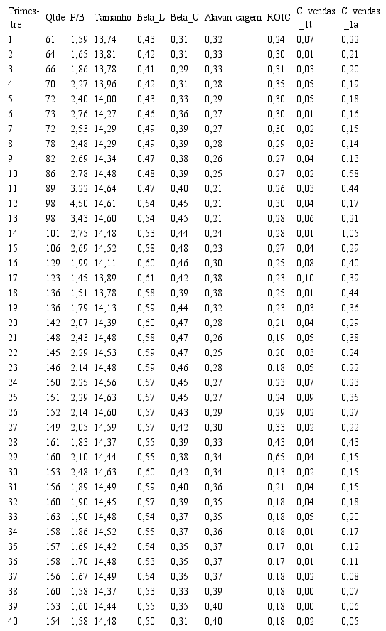 A Tabela 2 apresenta a quantidade de empresas analisada por trimestre e a média das variáveis por trimestre. No total, foram analisadas 168 empresas por 40 trimestres em um total de 4.972 observações.