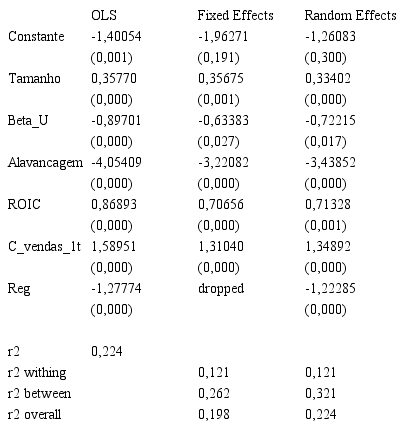 Os três modelos – OLS, Fixed Effects e Random Effects – implicaram, em geral, coeficientes com sinais coerentes entre si, sinalizando consistência nos resultados encontrados.