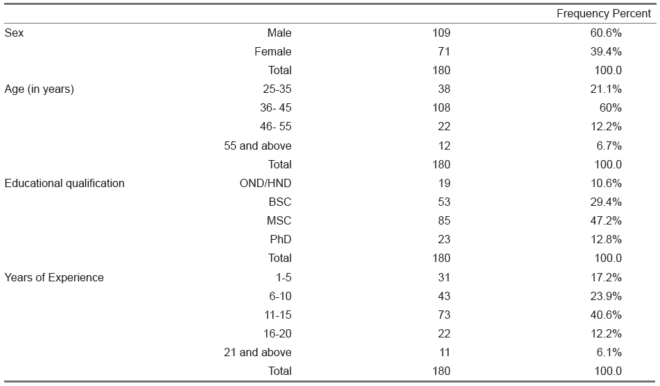 In order to investigate the objectives of this study and answer the hypotheses, the descriptive research method was employed. 210 questionnaires were administered to employees of three universities (70 each) in the south western region. However, only 187 were returned although seven of the returned questionnaires were either incompletely filled or had errors. Thus 180 questionnaires were used for our analysis. The questionnaire has three construct namely: change management, change resistance and readiness to change. Table 1 below shows the demographic profile of the respondents. 60.6% of the respondents were male which implies that the majority of the respondents were male. 57.2% were academic staff while the remaining 42.8% fall in the non-academic staff category. Majority of the respondents are above 35 but below 45yrs of age and constitute 60%, 21.1% are of 25-35 years of age, 12.2% are above 45 but below 55yrs while those above 50yrs constitute the lower percentage of 6.7% of the sample size. M.sc holders constitute the larger part of the population with 47.2% of the total sample size. 12.8% of the respondents are PhD holder, 29.4% are B.sc holders while OND/HND holders constitute 10.6% of the sample size. The respondents’ years of experience between 1-5years constitutes 17.2%, were those of 6-10years was 23.9%, 11-15year was 40.6%, 16-20years constitutes 12.2% and those respondents whose year of experience exceeds 20years was 6.1%.