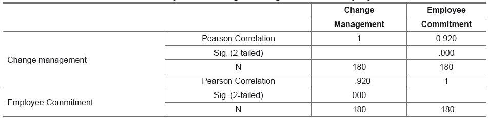 From table 2 below, it can be seen that the correlation coefficient of change management and employee commitment r =.092 at significant level of 0.01 (p˂.01) when n = 180 indicates that there is very strong relationship between change management and employee commitment. The table further revealed that p-value is .000 which is less than 0.01. Consequently, we reject the null hypothesis and accept the alternate hypothesis. It is therefore concluded that there exist a strong and direct relationship between change management and employee commitment in Nigerian universities. This is supported by the results of Ayinde and Akanni (2011) which revealed that employee perception of downsizing exercise (a form of change) influenced their commitment to work.