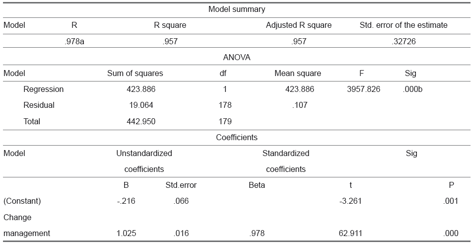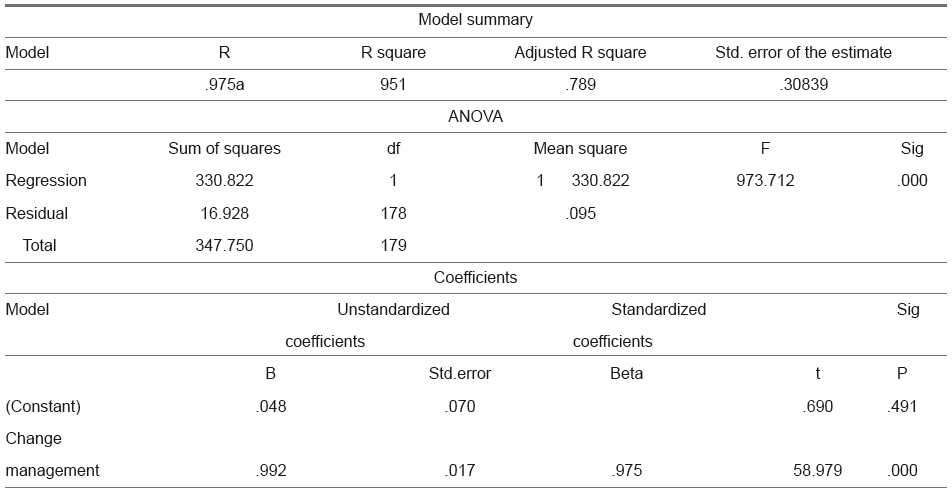 Table 3 below illustrates the regression analysis of successfulness of change programmes with employee readiness for change initiatives. The null hypothesis was rejected as r = 0.975 which indicate a significant and positive relationship between successfulness of change programmes and employees readiness for change. As a result, we accept the alternate hypothesis. Furthermore, the coefficient of determination (R2) of model hypothesis 2 is 0.951, which implies that only 95.1% of employee readiness for change explained variation in successfulness of change program. The remaining 4.9% unexplained variation is due to the other variables outside the regression model which are otherwise included in the stochastic error term.