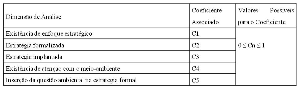 Cada um dos cinco coeficientes foi calculado somando-se a quantidade de pontos efetivamente obtidos pela empresa na dimensão de análise e dividindo pela quantidade de pontos possíveis nessa dimensão. Portanto, esses coeficientes puderam assumir qualquer valor entre 0 e 1, conforme consta na terceira coluna do Quadro 1; matematicamente: