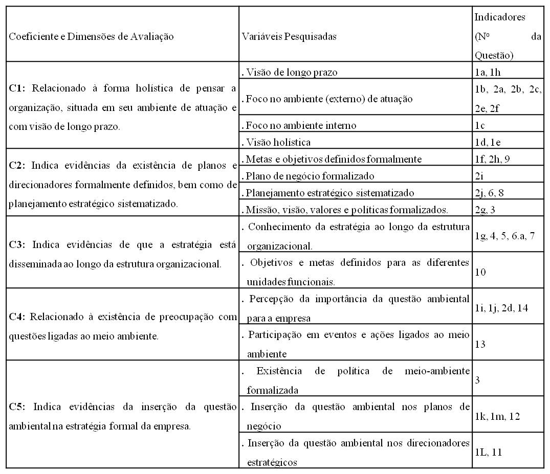 Como será explícito nos tópicos seguintes, sumariamente, a avaliação das estratégias das empresas estudadas fundamentou-se no desdobramento das quatro dimensões analíticas em variáveis de pesquisa. Estas variáveis, por sua vez, desdobraram-se em um conjunto maior de indicadores, cuja natureza menos complexa os tornaram mais fáceis de serem objetivamente identificados. Estes indicadores foram, então, organizados em um questionário relativamente simples e de fácil aplicação, viabilizando a operacionalização da pesquisa.