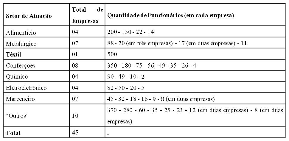 Com este intuito, o estudo foi realizado com 45 indústrias de diferentes portes atuantes no município de Capivari (SP), buscando avaliar a estratégia destas empresas e os atributos relacionados por meio da metodologia proposta. Uma vez que a questão ambiental é incorporada na multidimensionalidade da avaliação, foram selecionadas empresas pertencentes aos setores empresariais com potencial de agressão ao meio ambiente, tais como, têxtil, de confecções, metalúrgico, químico, de marcenaria, eletroeletrônico e alimentício.
