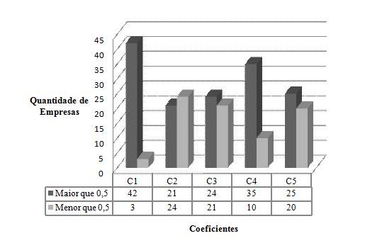 A Figura 2 mostra a quantidade de empresas cujos valores dos coeficientes estão acima e abaixo do valor de corte; as barras em cinza escuro representam a quantidade de empresas cujo valor para cada um dos cinco coeficientes é maior que 0,5, enquanto as barras mais claras representam as empresas cujo valor obtido para os mesmos é menor ou igual a 0,5.