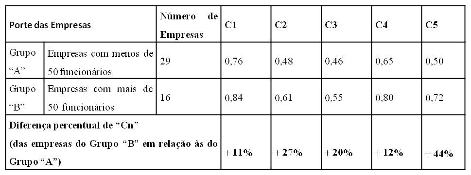 No Quadro 5 são apresentados os valores médios dos cinco coeficientes calculados para as empresas estratificadas segundo o porte; por facilidade, adotou-se o número de funcionários para essa estratificação dos dados.