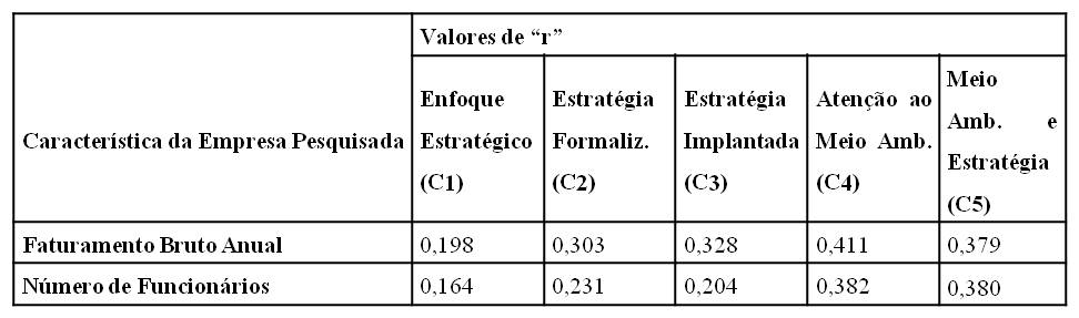 Do Quadro de valores críticos de “r”, apresentado em Triola (1999, p. 364), extrai-se que para 45 pares de dados amostrais (número de empresas pesquisadas) os valores críticos de “r” são 0,294 e 0,378, respectivamente para a = 0,05 e a = 0,01. Assim, de posse dos valores apresentados no Quadro 6 deste trabalho, conclui-se que, para o grupo de empresas pesquisadas, existem evidências estatísticas de correlação linear positiva entre cada uma das duas dimensões de avaliação ligadas à questão ambiental (C4 e C5) e o faturamento bruto da empresa, pois os valores de “r” são, respectivamente, 0,411 e 0,379. O mesmo ocorre entre C4 e C5 e o número de funcionários da empresa (valores de “r” são, respectivamente, 0,382 e 0,380).