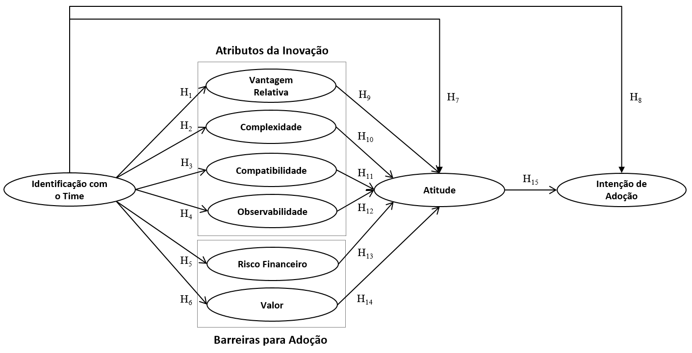 Segundo Rogers (2003), as características de vantagem relativa, compatibilidade, complexidade e observabilidade de uma inovação influenciam na taxa de adoção da mesma. Por outro lado, inovações impõem mudanças ao consumidor que podem gerar potenciais barreiras para adoção (Ram, 1987). Barreiras funcionais, como valor (relação custo-benefício) e risco financeiro (incerteza de consequências negativas), podem influenciar a atitude do consumidor em relação à adoção de uma inovação de serviços (Kleijnen et al., 2007; Klerck; Sweeney, 2007), como o Programa Sócio Torcedor. Sendo assim, propõem-se as seguintes hipóteses: