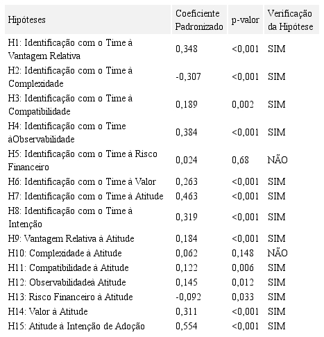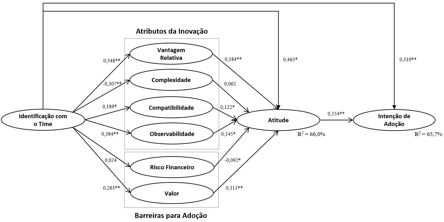 Por fim, o modelo proposto indicou uma forte relação entre atitude com relação à adoção e intenção de adoção (H15), com o efeito direto de atitude sobre intenção apresentando o maior coeficiente padronizado do modelo (0,554, p-valor < 0,001). Notou-se ainda que a atitude com relação à adoção e a identificação com o time, além dos efeitos indiretos dos outros construtos mediados pela atitude (que teve por sua vez 66% de sua variabilidade explicada pelo modelo), foram capazes de explicar 65,7% da variância observada na intenção de adoção.