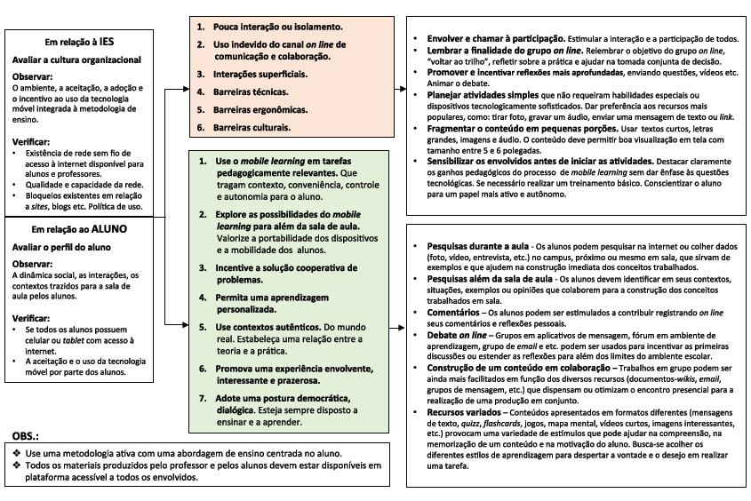 Observa-se também a necessidade de checar e garantir a qualidade e a abrangência do serviço de conexão à internet móvel da instituição de ensino para que sejam desenvolvidas atividades de m-learning adequadas às condições técnicas disponíveis, assim como a obtenção de suporte da instituição para que as possíveis ocorrências sejam conduzidas da forma mais favorável ao desenvolvimento da experiência de uso do m-learning.