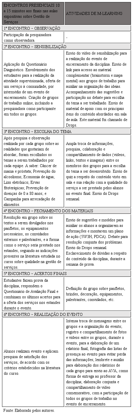 Com o intuito de promover o ambiente necessário para o desenvolvimento do protocolo, foi construído um cronograma de atividades, alinhado com o plano de aula do professor da IES, que estabeleceu para cada encontro presencial um objetivo apoiado pelas ações de m-learning (quadro 8).