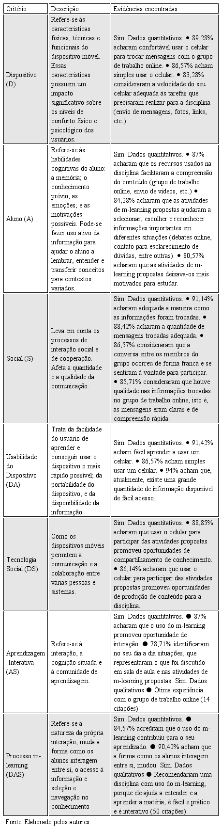 Os resultados da pesquisa apontam evidências que reforçam todos os aspectos e critérios analisados pelo modelo teórico adotado FRAME (KOOLE, 2009). Assim, este estudo apresenta contribuições para a literatura sobre o tema m-learning com dados empíricos, além aprofundar a compreensão sobre o uso dos dispositivos móveis no ensino superior, no âmbito do contexto nacional.